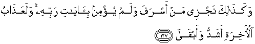 127. Dan demikianlah Kami membalas orang yang melampaui batas dan tidak percaya kepada ayat-ayat Tuhannya. Dan sesungguhnya azab di akhirat itu lebih berat dan lebih kekal.