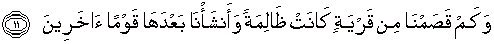 11. Dan berapa banyaknya (penduduk) negeri yang zalim yang teIah Kami binasakan, dan Kami adakan sesudah mereka itu kaum yang lain (sebagai penggantinya).