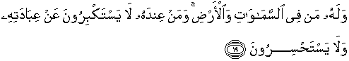 19. Dan kepunyaan-Nyalah segala yang di langit dan di bumi. Dan malaikat-malaikat yang di sisi-Nya, mereka tiada mempunyai rasa angkuh untuk menyembah-Nya dan tiada (pula) merasa letih.