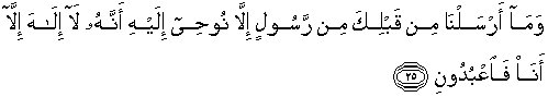 25. Dan Kami tidak mengutus seorang rasulpun sebelum kamu melainkan Kami wahyukan kepadanya: "Bahwasanya tidak ada Tuhan (yang hak) melainkan Aku, maka sembahlah olehmu sekalian akan Aku."