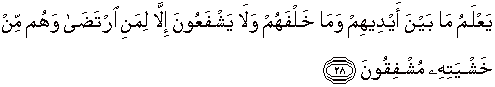 28. Allah mengetahui segala sesuatu yang dihadapan mereka (malaikat) dan yang di belakang mereka, dan mereka tiada memberi syafaat