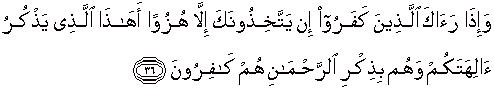 36. Dan apahila orang-orang kafir itu melihat kamu, mereka hanya membuat kamu menjadi olok-olok. (Mereka mengatakan): "Apakah ini orang yang mencela tuhan-tuhan-mu?", padahal mereka adaIah orang-orang yang ingkar mengingat Allah Yang Maha Pemurah.
