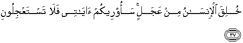 37. Manusia telah dijadikan (bertabiat) tergesa-gesa. Kelak akan Aku perIihatkan kepadamu tanda-tanda azab-Ku. Maka janganlah kamu minta kepada-Ku mendatangkannya dengan segera.