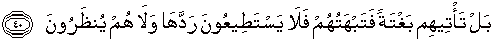 40. Sebenarnya (azab) itu akan datang kepada mereka dengan sekonyong-konyong lalu membuat mereka menjadi panik, maka mereka tidak sanggup menolaknya dan tidak (pula) mereka diberi tangguh.