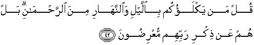 42. Katakanlah: "Siapakah yang dapat memelihara kamu di waktu malam dan siang hari dari (azab Allah) Yang Maha Pemurah?" Sebenarnya mereka adalah orang-orang yang berpaling dari mengingati Tuhan mereka.