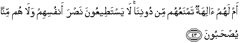 43. Atau adakah mereka mempunyai tuhan-tuhan yang dapat memelihara mereka dari (azab) Kami. Tuhan-tuhan itu tidak sanggup menolong diri mereka sendiri dan tidak (pula) mereka dilindungi dari (azab) Kami itu?