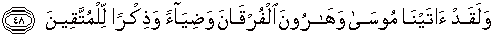 48. Dan sesungguhnya telah Kami berikan kepada Musa dan Harun Kitab Taurat dan penerangan serta pengajaran bagi orang-orang yang bertakwa.