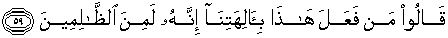 59. Mereka berkata: "Siapakah yang melakukan perbuatan ini terhadap tuhan-tuhan kami, sesungguhnya dia termasuk orang-orang yang zalim."