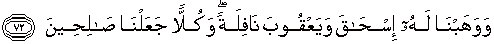 72. Dan Kami telah memberikan kepada-nya (Ibrahim) lshak dan Ya'qub, sebagai suatu anugerah (daripada Kami). Dan masing-masingnya Kami jadikan orang-orang yang saleh