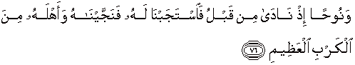 76. Dan (ingatlah kisah) Nuh, sebelum itu ketika dia berdoa, dan Kami memperkenankan doanya, lalu Kami selamatkan dia beserta keluarganya dari bencana yang besar.