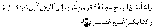 81. Dan (telah Kami tundukkan) untuk Sulaiman angin yang sangat kencang tiupannya yang berhembus dengan perintahnya ke negeri yang kami telah memberkatinya. Dan adalah Kami Maha Mengetahui segala sesuatu.
