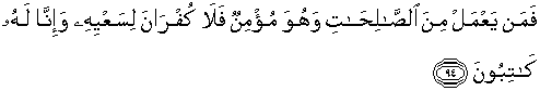 94. Maka barang siapa yang mengerjakan amal saleh, sedang ia beriman, maka tidak ada pengingkaran terhadap amalannya itu dan sesungguhnya Kami menuliskan amalannya itu untuknya.