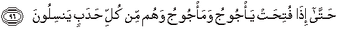 96. Hingga apabila dibukakan (tembok) Ya'juj dan Ma'juj, dan mereka turun dengan cepat dari seluruh tempat yang tinggi.