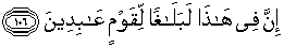 106. Sesungguhnya (apa yang disebutkan) dalam (surat) ini, benar-benar menjadi peringatan bagi kaum yang menyembah (Allah).