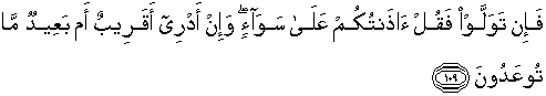 109. Jika mereka berpaling, maka katakanlah: "Aku telah menyampaikan kepada kamu sekalian (ajaran) yang sama (antara kita) dan aku tidak mengetahui apakah yang diancamkan kepadamu itu sudah dekat atau masih jauh?."