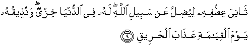 untuk menyesatkan manusia dari jalan Allah. Ia mendapat kehinaan di dunia dan dihari kiamat Kami merasakan kepadanya azab neraka yang membakar.