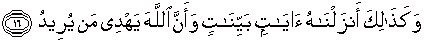 16. Dan demikianlah Kami telah menurunkan Al Quran yang merupakan ayat-ayat yang nyata, dan bahwasanya Allah memberikan petunjuk kepada siapa yang Dia kehendaki.
