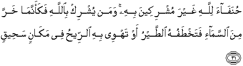 31. dengan ikhlas kepada Allah, tidak mempersekutukan sesuatu dengan Dia. Barangsiapa mempersekutukan sesuatu dengan Allah, maka adalah ia seolah-olah jatuh dari langit lalu disambar oleh burung, atau diterbangkan angin ke tempat yang jauh.