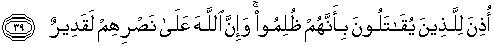 39. Telah diizinkan (berperang) bagi orang-orang yang diperangi, karena sesungguhnya mereka telah dianiaya. Dan sesungguhnya Allah, benar-benar Maha Kuasa menolong mereka itu,