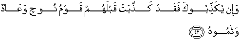 42. Dan jika mereka (orang-orang musyrik) mendustakan kamu, maka sesungguhnya telah mendustakan juga sebelum mereka kaum Nuh, 'Aad dan Tsamud,