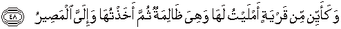 48. Dan berapalah banyaknya kota yang Aku tangguhkan (azab-Ku) kepadanya, yang penduduknya berbuat zalim, kemudian Aku azab mereka, dan hanya kepada-Kulah kembalinya (segala sesuatu).