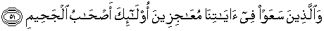 51. Dan orang-orang yang berusaha dengan maksud menentang ayat- ayat Kami dengan melemahkan (kemauan untuk beriman); mereka itu adalah penghuni-penghuni neraka.
