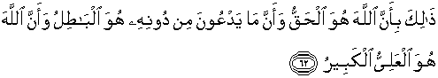 62. (Kuasa Allah) yang demikian itu, adalah karena sesungguhnya Allah, Dialah (Tuhan) Yang Haq dan sesungguhnya apa saja yang mereka seru selain dari Allah, itulah yang batil, dan sesungguhnya Allah, Dialah Yang Maha Tinggi lagi Maha Besar.