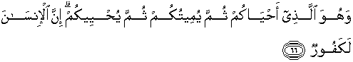 66. Dan Dialah Allah yang telah menghidupkan kamu, kemudian mematikan kamu, kemudian menghidupkan kamu (lagi), sesungguhnya manusia itu, benar-benar sangat mengingkari nikmat.