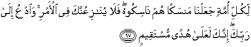 67. Bagi tiap-tiap umat telah Kami tetapkan syari'at tertentu