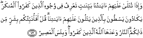 72. Dan apabila dibacakan di hadapan mereka ayat-ayat Kami yang