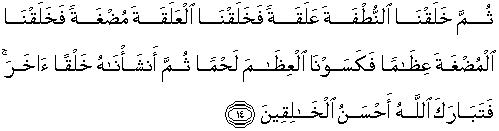 14. Kemudian air mani itu Kami jadikan segumpal darah, lalu