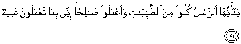 51. Hai rasul-rasul, makanlah dari makanan yang baik-baik, dan kerjakanlah amal yang saleh. Sesungguhnya Aku Maha Mengetahui apa yang kamu kerjakan.