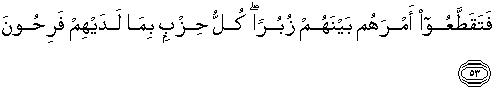 53. Kemudian mereka (pengikut-pengikut rasul itu) menjadikan agama mereka terpecah belah menjadi beberapa pecahan. Tiap-tiap golongan merasa bangga dengan apa yang ada pada sisi mereka (masing-masing).