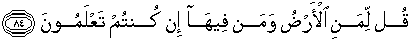 84. Katakanlah: "Kepunyaan siapakah bumi ini, dan semua yang ada padanya, jika kamu mengetahui?"
