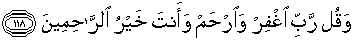 118. Dan katakanlah: "Ya Tuhanku berilah ampun dan berilah rahmat, dan Engkau adalah Pemberi rahmat Yang Paling baik."