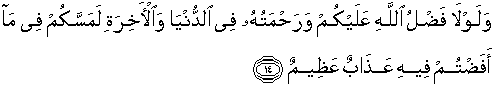 14. Sekiranya tidak ada kurnia Allah dan rahmat-Nya kepada kamu semua di dunia dan di akhirat, niscaya kamu ditimpa azab yang besar, karena pembicaraan kamu tentang berita bohong itu.