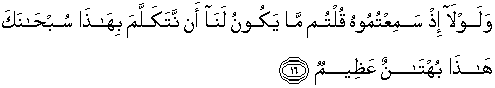 16. Dan mengapa kamu tidak berkata, diwaktu mendengar berita bohong itu: "Sekali-kali tidaklah pantas bagi kita memperkatakan ini, Maha Suci Engkau (Ya Tuhan kami), ini adalah dusta yang besar."