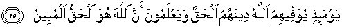 25. Di hari itu, Allah akan memberi mereka balasan yag setimpal menurut semestinya, dan tahulah mereka bahwa Allah-lah yang Benar, lagi Yang menjelaskan (segala sesutatu menurut hakikat yang sebenarnya).