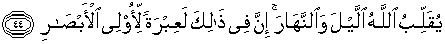 44. Allah mempergantikan malam dan siang. Sesungguhnya pada yang demikian itu terdapat pelajaran yang besar bagi orang-orang yang mempunyai penglihatan.