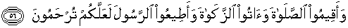 56. Dan dirikanlah sembahyang, tunaikanlah zakat, dan taatlah kepada rasul, supaya kamu diberi rahmat.