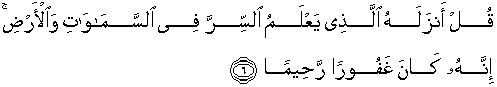 6. Katakanlah: "Al Quran itu diturunkan oleh (Allah) yang mengetahui rahasia di langit dan di bumi. Sesungguhnya Dia adalah Maha Pengampun lagi Maha Penyayang."