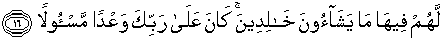 16. Bagi mereka di dalam surga itu apa yang mereka kehendaki, sedang mereka kekal (di dalamnya). (Hal itu) adalah janji dari Tuhanmu yang patut dimohonkan (kepada-Nya).