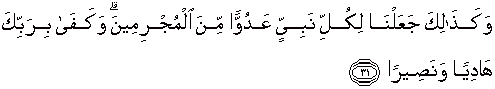 31. Dan seperti itulah, telah Kami adakan bagi tiap-tiap nabi, musuh dari orang-orang yang berdosa. Dan cukuplah Tuhanmu menjadi Pemberi petunjuk dan Penolong.