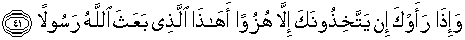 41. Dan apabila mereka melihat kamu (Muhammad), mereka hanyalah menjadikan kamu sebagai ejekan (dengan mengatakan): "Inikah orangnya yang di utus Allah sebagai Rasul?.