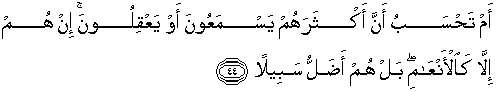 44. atau apakah kamu mengira bahwa kebanyakan mereka itu mendengar atau memahami. Mereka itu tidak lain, hanyalah seperti binatang ternak, bahkan mereka lebih sesat jalannya (dari binatang ternak itu).