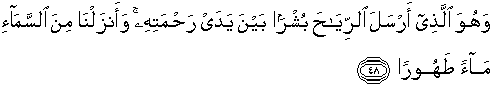 48. Dia lah yang meniupkan angin (sebagai) pembawa kabar gembira dekat sebelum kedatangan rahmat-nya (hujan); dan Kami turunkan dari langit air yang amat bersih,