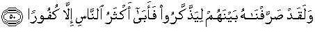 50. Dan sesungguhnya Kami telah mempergilirkan hujan itu diantara manusia supaya mereka mengambil pelajaran (dari padanya); maka kebanyakan manusia itu tidak mau kecuali mengingkari (nikmat).