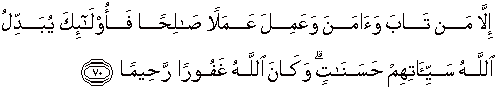 70. kecuali orang-orang yang bertaubat, beriman dan mengerjakan amal saleh; maka itu kejahatan mereka diganti Allah dengan kebajikan. Dan adalah Allah maha Pengampun lagi Maha Penyayang.