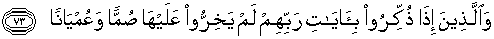 73. Dan orang-orang yang apabila diberi peringatan dengan ayat- ayat Tuhan mereka, mereka tidaklah menghadapinya sebagai orang- orang yang tuli dan buta.