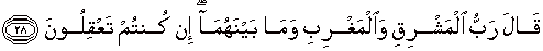 28. Musa berkata: "Tuhan yang menguasai timur dan barat dan apa yang ada di antara keduanya: (Itulah Tuhanmu) jika kamu mempergunakan akal."